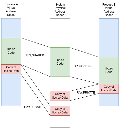 - the data is loaded PROT_READ|PROT_WRITEandMAP_PRIVATEso that it's initialized with the data in the exe/shared library, but, any changes that are made are private to the process.
